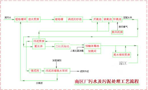 該廠2013年11月16日建成投入試運(yùn)行,2014年7月21日通過(guò)環(huán)?⒐を(yàn)收。目前該廠保持持續(xù)、穩(wěn)定正常運(yùn)行,其中2018年處理污水量14653417噸,處理率達(dá)到80.3%以上。工藝流程圖如下: