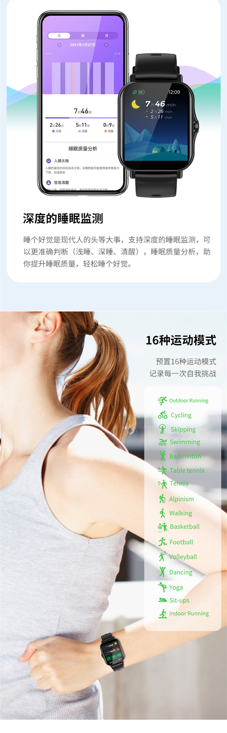 睡眠模式 | 對(duì)睡眠進(jìn)行檢測(cè),記錄睡眠時(shí)長(zhǎng) | |