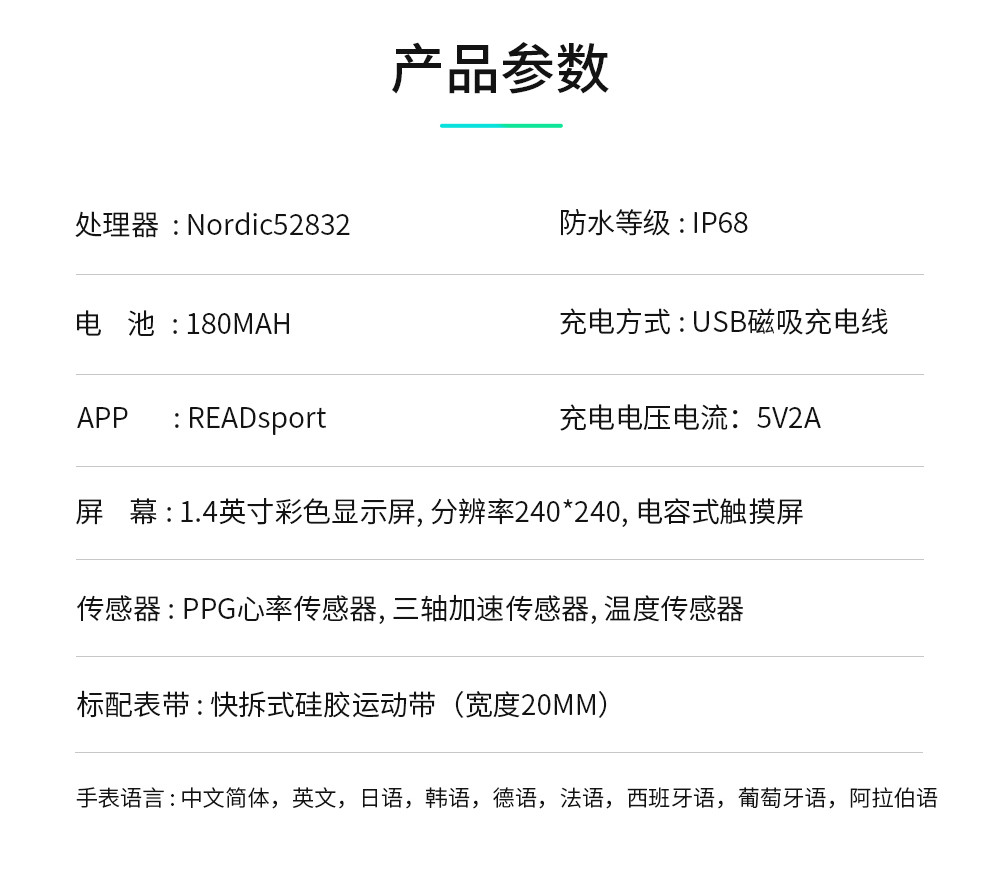 產(chǎn)品類型:智能穿戴? ? ? ? ? ? ? ? ? ? ? ? ? |? ?信息推送:支持 屏幕尺寸:1.4inch? ? ? ? ? ? ? ? ? ? ? ? ? ? |? ?來電提醒:支持 分辨率:240*240? ? ? ? ? ? ? ? ? ? ? ? ? ? ?|? ?防水:IP68 操作平臺(tái):NRF52832? ? ? ? ? ? ? ? ? ? ? ?|? ?震動(dòng)模式:支持 材質(zhì):鋅合金? ? ? ? ? ? ? ? ? ? ? ? ? ? ? ? ? ? |? ?側(cè)鍵:支持 內(nèi)存:64KB+512KB? ? ? ? ? ? ? ? ? ? ? ? ?|? ?充電器:磁鐵彈簧針 存儲(chǔ):64M bit? ? ? ? ? ? ? ? ? ? ? ? ? ? ? ? ? |? ?GPS:不支持 功能介紹? ? ? ? ? ? ? ? ? ? ? ? ? ? ? ? ? ? ? ? ? ?|? ? APP:支持專門APP 藍(lán)牙:藍(lán)牙 4.0, 支持安卓和iOS系統(tǒng)? ?|? ?語言:多語言 多運(yùn)動(dòng)模式:支持? ? ? ? ? ? ? ? ? ? ? ? ? ? ? |? ?手表語言:APP語言 心率測(cè)試:3300光學(xué)心率傳感器? ? ? ? |? ? 說明書語言:手表語言 體溫測(cè)試:支持? ? ? ? ? ? ? ? ? ? ? ? ? ? ? ? ?|? ? 結(jié)構(gòu)特點(diǎn) 呼吸功能:支持? ? ? ? ? ? ? ? ? ? ? ? ? ? ? ? ?|? ? 尺寸:43.25*36.25*9.5mm 節(jié)拍器:支持? ? ? ? ? ? ? ? ? ? ? ? ? ? ? ? ? ? |? ? 電池:180MA 計(jì)步器:支持? ? ? ? ? ? ? ? ? ? ? ? ? ? ? ? ? ? |? ? 顏色:玫瑰金,黑色,銀色 睡眠監(jiān)測(cè):支持? ? ? ? ? ? ? ? ? ? ? ? ? ? ? ? ?|? ?包裝尺寸:102*83*68MM G-傳感器:支持